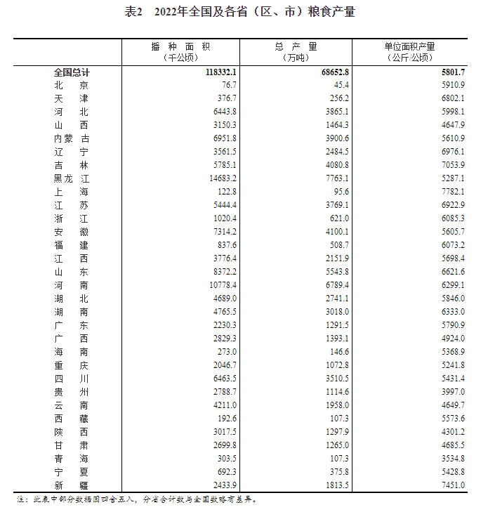 根据对全国31个省(区、市)的调查,2022年全国粮食播种面积、单位面积产量和总产量分别如下:一、全国粮食播种面积118332千公顷(177498万亩),比2021年增加701千公顷(1052万亩),增长0.6%。其中谷物[1]播种面积99269千公顷(148903万亩),比2021年减少908千公顷(1362万亩),下降0.9%。二、全国粮食单位面积产量5802公斤/公顷(387公斤/亩),比2021年减少3.3公斤/公顷(0.2公斤/亩),下降0.1%。其中谷物单位面积产量6379公斤/公顷(425公斤/亩),比2021年增加62.7公斤/公顷(4.2公斤/亩),增长1.0%。三、全国粮食总产量68653万吨(13731亿斤),比2021年增加368万吨(74亿斤),增长0.5%。其中谷物产量63324万吨(12665亿斤),比2021年增加49万吨(10亿斤)。